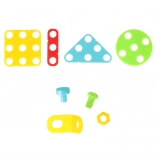 Acest mozaic creativ combină piese colorate, șuruburi și unelte pentru ca cei mici să poată compune modele, animăluțe și simple modele 3D. Bormașina electrică pe baterii și șurubelnița transformă jocul într-o adevărată aventură de bricolaj și susțin coordonarea mână–ochi.