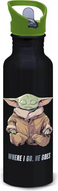 Sticlă de băut din aluminiu stilată cu motiv Mandalorian și îndrăgitul personaj Grogu. O alegere excelentă pentru fanii seriei.