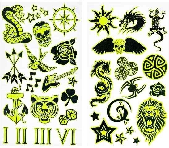 Tatuaje care strălucesc în întuneric – două foi de tatuaje fosforescente. Diferite imagini.