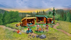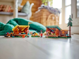 Setul LEGO Friends Căsuțele prietenoase din tabăra de vară le oferă tinerilor constructori posibilitatea de a crea povești cu personajele Paisley, Zack și Sky, care pornesc într-un camping confortabil. Include două cabane cu acoperișuri ce se pot deschide, pentru a arunca o privire în interior. Personajele sunt pregătite pentru înnoptare cu saci de dormit, plimbări cu bicicletele de munte și muzică la foc, unde prăjesc bezele.