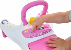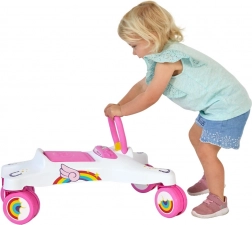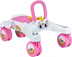 Acest vehicul de împins drăgălaș, cu motiv unicorn, este partenerul perfect pentru joaca zilnică și pentru antrenarea stabilității. Datorită roților pivotante la 360°, se întoarce ușor pe loc, iar copilul trece lin chiar și prin spații înguste. Construcția din plastic robust oferă susținere și siguranță, iar claxonul adaugă un plus de distracție.