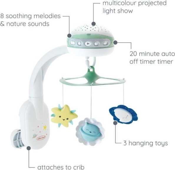 Liniștește bebelușul cu lumină blândă, mișcare și muzică. Acest carusel muzical cu proiector 3‑în‑1 INFANTINO proiectează steluțe colorate, redă 6 melodii și 2 sunete din natură și, după 20 de minute, se estompează automat. Datorită sensorului inteligent de sunet, se reactivează în decurs de 120 de minute la auzul zgomotelor, pentru a ajuta bebelușul să adoarmă din nou.