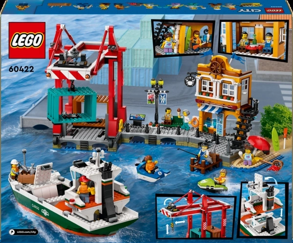LEGO City port la mare cu navă de marfă 60422: macara funcțională, navă, magazin, restaurant, plajă și 8 minifigurine. 1226 piese pentru copii de la 8 ani.