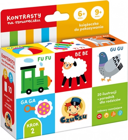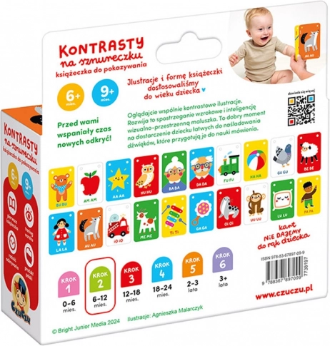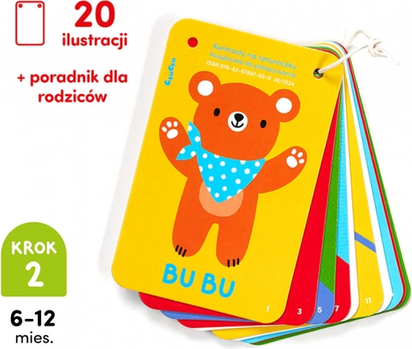 Descoperă lumea împreună cu bebelușul datorită cărticelei cu contraste CzuCzu pe șnur. Contrastul ridicat al ilustrațiilor stimulează vederea, susține dezvoltarea vorbirii și a concentrării. Datorită perforațiilor practice și șnurului, o poți prinde ușor deasupra pătuțului sau o poți lua cu tine în călătorii.