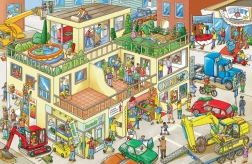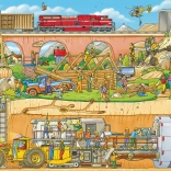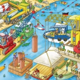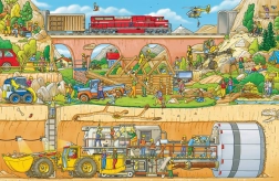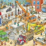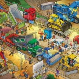 În carte sunt scene ilustrate cu detalii care prezintă un mediu viu de șantier cu diverse mașini de construcții.
