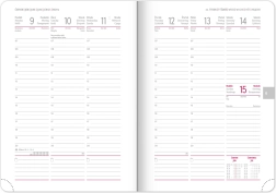Agenda beneficiază de opțiunea de ștanțare a anului și a logo-ului, fiind ideală pentru uz personal sau profesional. Include un program săptămânal cu calendariu în limba cehă, slovacă, engleză, germană, maghiară și rusă.