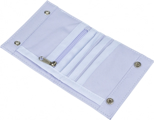 Portofel practic pentru studenți, în eleganta nuanță lila, oferă închidere cu 2 capse, buzunar cu fermoar pentru monede și spațiu bine gândit pentru bancnote, carduri și documente – ideal pentru școală și pentru purtare zilnică.