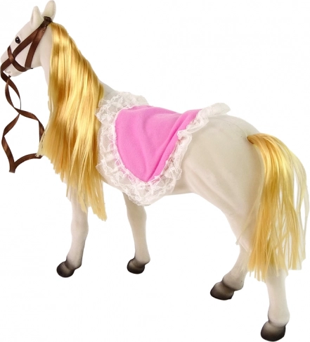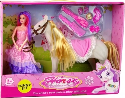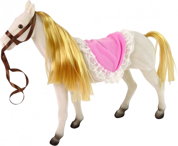 Setul conține păpușa prințesă cu membre flexibile și un cal alb, realizat dintr-un material plăcut pentru o înfățișare realistă.