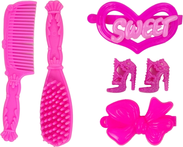 Setul include un pieptene roz, o perie și alte accesorii stilistice care sprijină îngrijirea și creativitatea în timpul jocului.