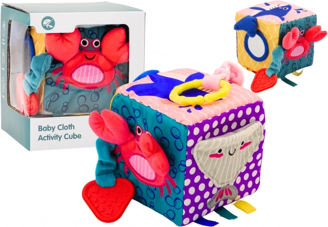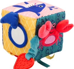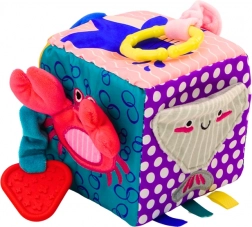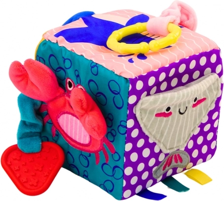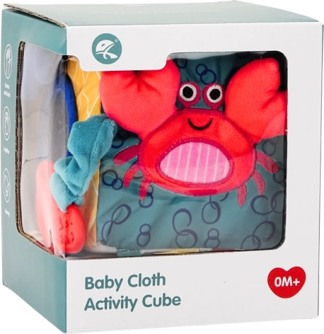 Cubul conține și elemente foșnitoare care, la atingere, emit sunete delicate, stimulând auzul și încurajând joaca.