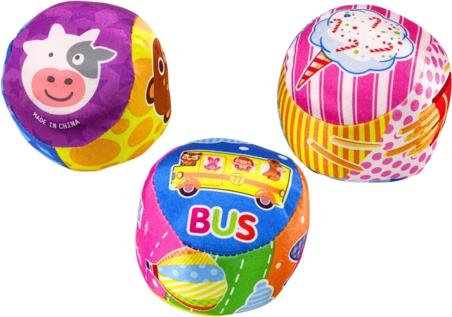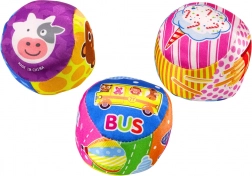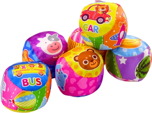 Minge moale decorată cu modele colorate, ce ilustrează animăluțe și fructe, stimulează imaginația copilului și îi captează atenția datorită culorilor intense și vii. Materialul sigur și moale asigură că este ideală pentru mâinile delicate ale copiilor, iar construcția sa ușoară facilitează prinderea, rostogolirea și aruncarea.