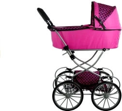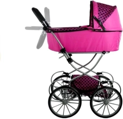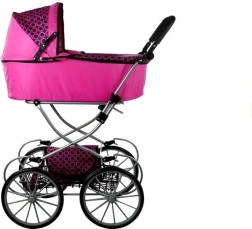 Căruciorul retro pentru păpuși Alice îmbină designul elegant cu funcționalitatea. Landou înalt și adânc, cadru metalic cu efect argintiu și roți mari, înguste din spumă‑cauciuc asigură deplasare lină și manevrabilitate excelentă acasă și în exterior. Mânerul reglabil cu înveliș moale din spumă permite ajustarea perfectă la înălțimea copilului, iar blocarea de siguranță previne plierea accidentală.