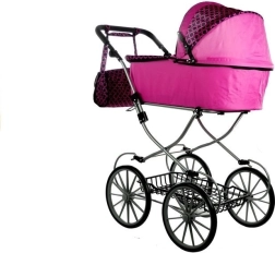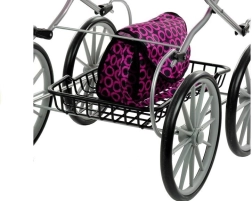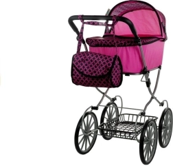 Landou încăpător pentru păpuși de până la 69 cm, coș inferior pentru accesorii și geantă cu închidere, într-un design asortat.