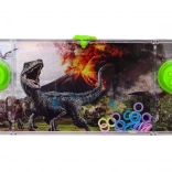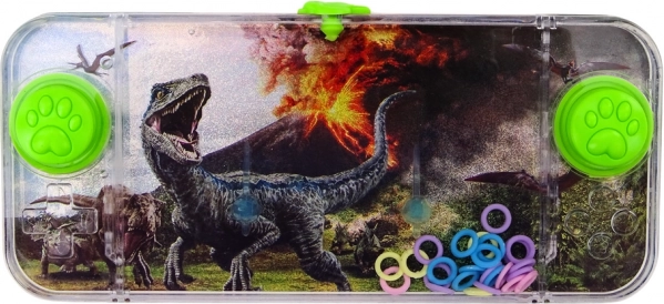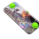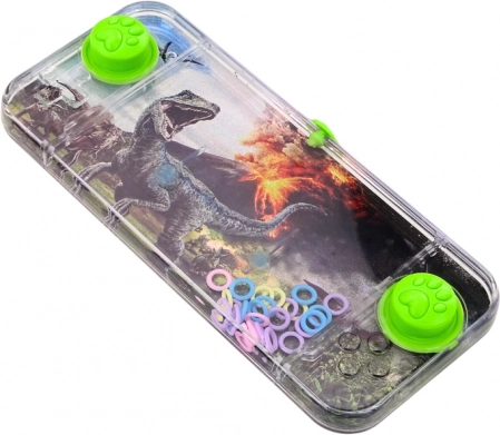 Jocul de buzunar cu apă, cu motivul dinozaurului Carnotaurus, este o jucărie simplă, dar captivantă. În rezervorul transparent, inelele colorate plutesc liber, iar sarcina ta este, cu ajutorul celor două butoane verzi, să dozezi precis presiunea astfel încât inelele să se așeze pe cele două pini din interior.