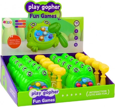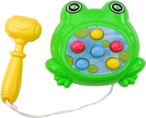 Mini-jocul în forma unei broscuțe verzi este versiunea mobilă a clasicului Whac‑a‑Mole: din orificii apar neașteptat ținte, iar sarcina este să fie lovite cât mai rapid cu ciocănelul inclus. Datorită dimensiunilor compacte îl luați ușor în excursii, la picnic sau în vacanță.