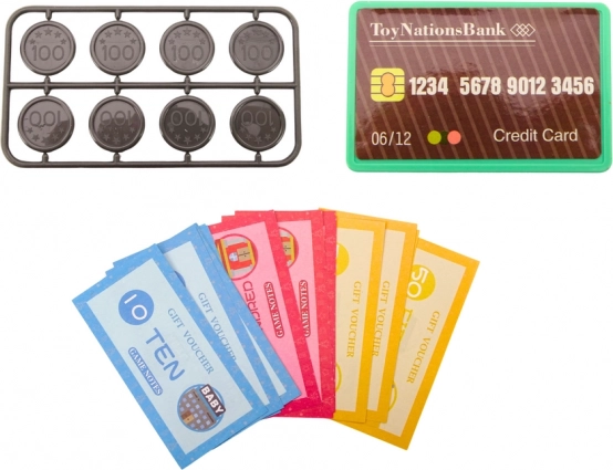 - Coș cu alimente, monede și bancnote/cupoane din plastic, card de plată
