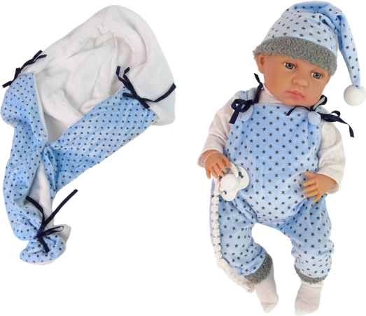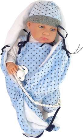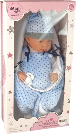 Această păpușă de 46 cm are un aspect realist, cu brațe, picioare și cap mobil, ceea ce contribuie la o experiență de joc cu adevărat autentică. Materialele moi și plăcute asigură că păpușa este plăcută la atingere. Copilul se poate juca schimbând hainele, deoarece păpușa are haine ușor de schimbat. Hainele includ un pijama albastru-negru și o pătură cu modele de stele.