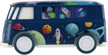 Autobuzul este proiectat cu culori vii și motive spațiale care captează atenția oricărui copil.