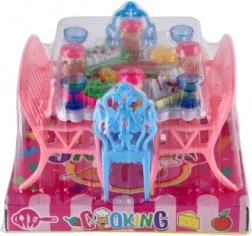Elementele vesele în roz și albastru, alături de masa albă, creează un mix de culori atrăgător. Mini-accesoriile realizate realist oferă jocului de-a restaurantul acel strop de farmec.
