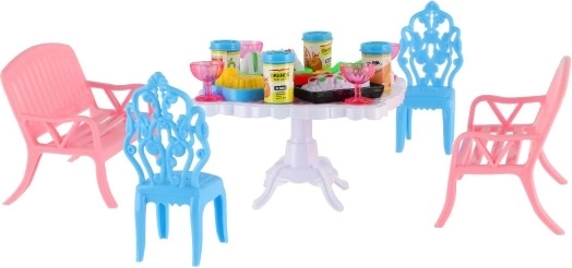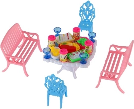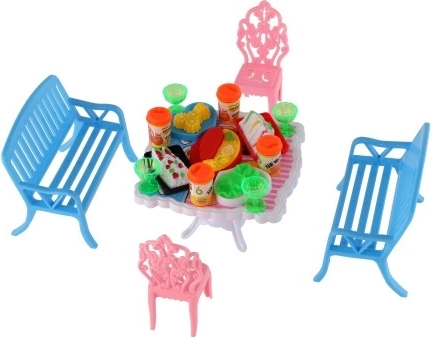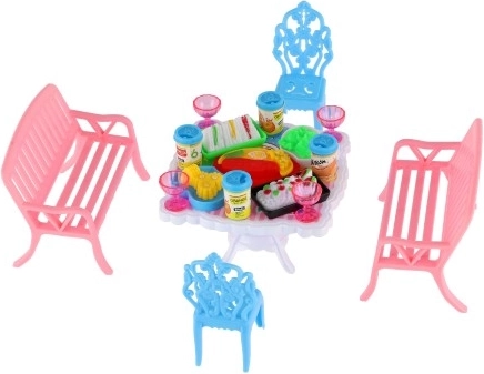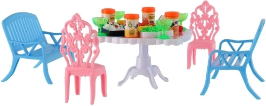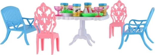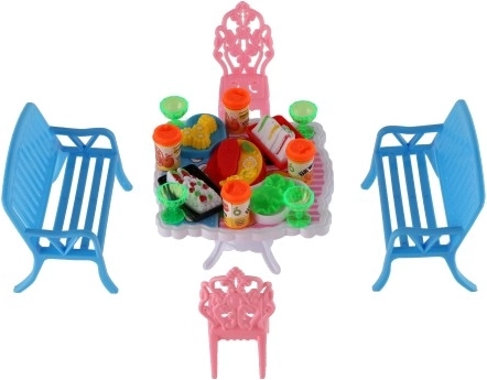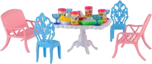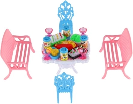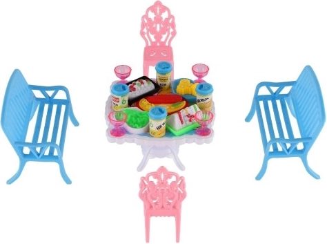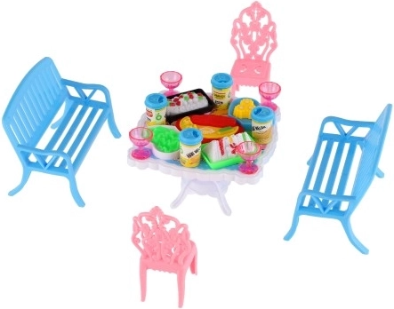 Setul conține 2 băncuțe, 2 scăunele și o masă, completate de 13 piese de accesorii – păhărele, doze, farfurii și o tavă. Tot ce trebuie pentru un adevărat ospăț al păpușilor.