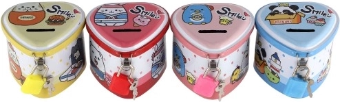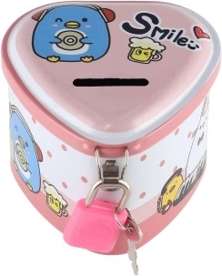 Pușculița în formă de inimă, în culorile roșu, roz, albastru și galben, cu ilustrații drăguțe, încurajează bucuria de a economisi și este o decorațiune frumoasă pentru camera copilului.