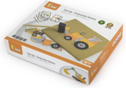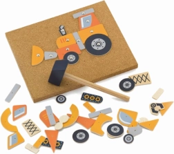 Descoperiți un joc distractiv și educativ în spirit Montessori. Copiii pot reproduce modele de vehicule de construcții sau își pot crea propriile idei. Piesele au margini rotunjite și orificii pre-găurite, astfel încât se prind ușor și în siguranță pe tabla de plută.