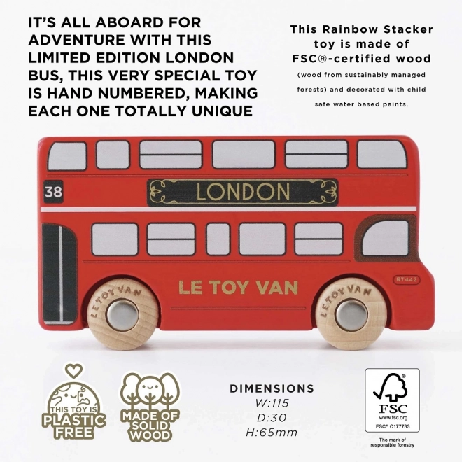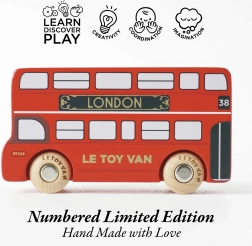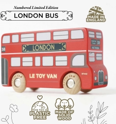 Descoperiți farmecul Londrei cu acest autobuz din lemn frumos realizat, care este compatibil cu toate garajele și trenurile de la Le Toy Van. Datorită roților robuste și materialului durabil cu certificare FSC® aceste jucării oferă o experiență sigură în mâinile dumneavoastră.