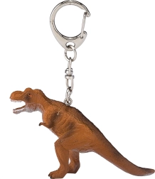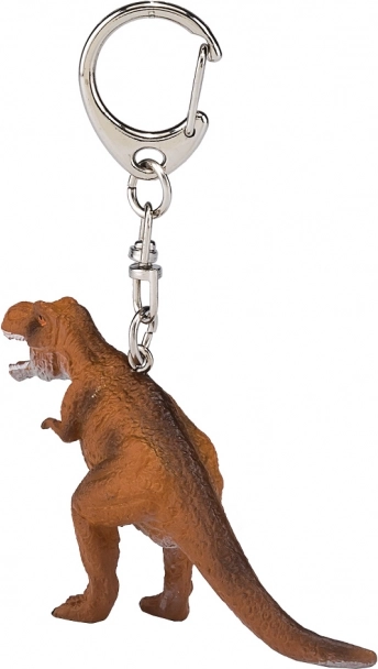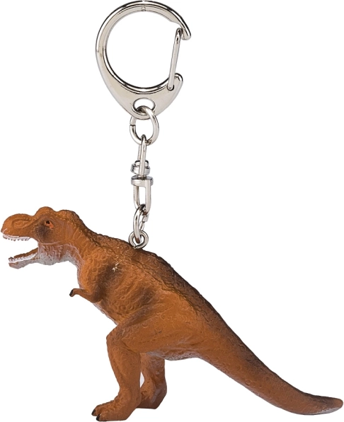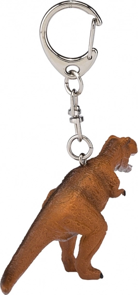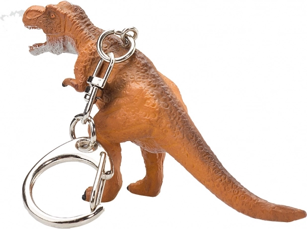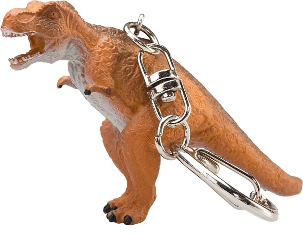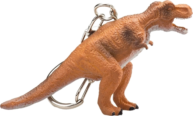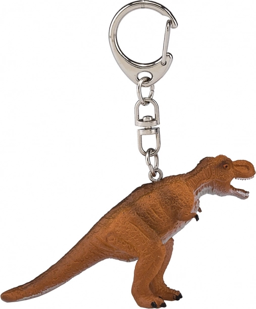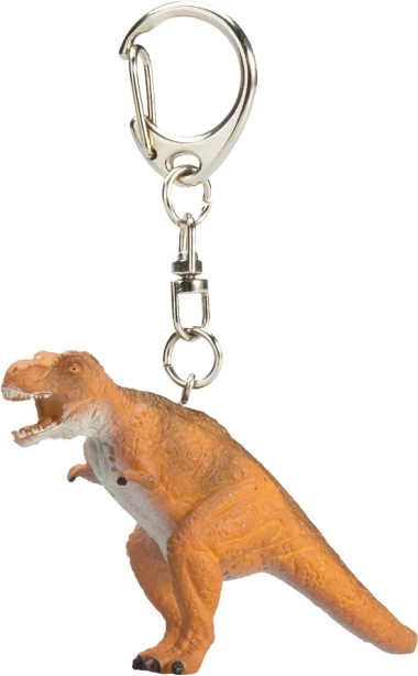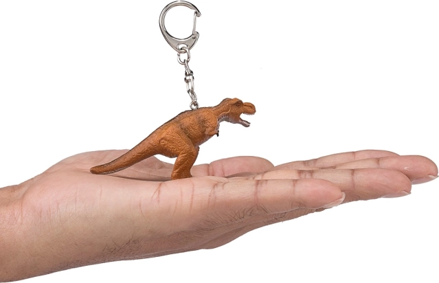 Figurina dinozaur de pe breloc este prelucrată cu detalii realiste care imită un adevărat Tyrannosaurus rex.