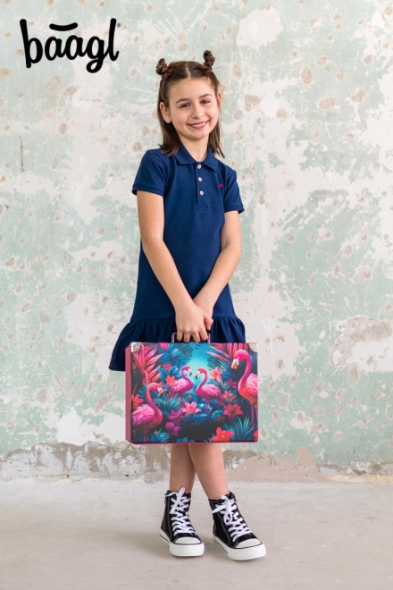 Geanta cu motiv de flamingo și plante tropicale adaugă stil fiecărui școlar.