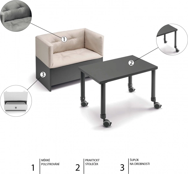 • Poate fi folosită până la 11 kg greutatea copilului, iar ulterior servește ca canapea cu sertar și măsuță