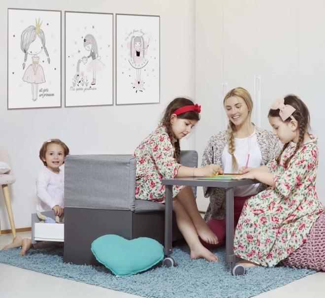 Comodă de înfășat stilată pentru copii de la naștere până la 11 kg și canapea practică cu măsuță pentru copii până la 14 ani, în același produs.