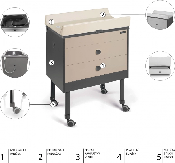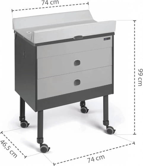 Comoda pentru înfășat include o cădiță pentru bebeluși cu 2 șezuturi modelate anatomic, dintre care unul are o înclinație ideală pentru copii până la 6 luni, iar celălalt pentru 6–12 luni. Cădița este echipată cu dop și scurgere pentru evacuarea facilă a apei. Două sertare spațioase oferă suficient loc pentru depozitarea scutecelor sau a altor produse destinate igienei copilului.