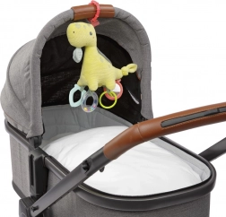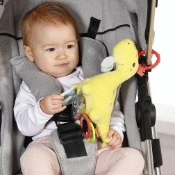 Această jucărie moale și prietenoasă, cu motiv de dinozaur, dezvoltă simțurile copilului și motricitatea fină. Diferitele texturi, inelele din plastic și pâsâitoarea din interior îi încurajează pe cei mici să apuce, să strângă și să exploreze. Oglinda integrată susține autocunoașterea, iar elementele colorate invită la joacă.