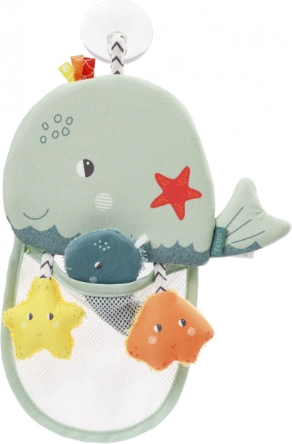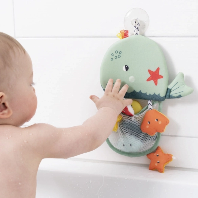 Suportul practic în forma unei balene drăgălașe menține baia mereu ordonată, având în același timp jucăriile de baie mereu la îndemână. Datorită ventuzei, balena poate fi fixată pe perete, iar jucăriile mai mici pot fi depozitate în plasa ei, unde, datorită respirabilității, se și usucă. Suportul este echipat cu hârtie foșnitoare și trei jucării din pluș cu buclă.