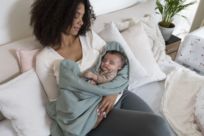 Pătură foarte fină, ideală pentru înfășarea bebelușului acasă sau în timpul plimbărilor în aer liber.