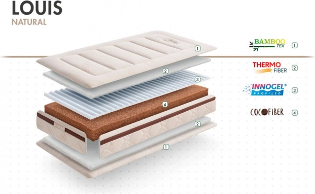 Miezul, realizat din fibră de cocos, este 100% natural și ecologic. Oferă o respirabilitate ridicată și o ventilare optimă. Datorită stratului Visco Innogel® salteaua Louis are o adaptabilitate excelentă.