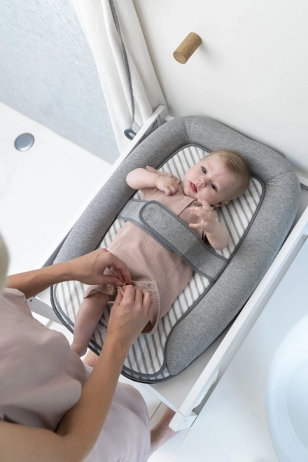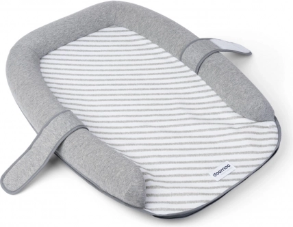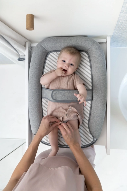 Salteluța Doomoo Cosy Care este dotată cu o centură de siguranță care păstrează copilul într-o poziție sigură în timpul schimbării.