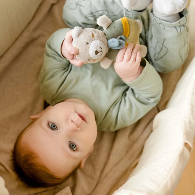 Acest ursuleț de pluș moale, cu zgomot de zornăit, sprijină simțul tactil, auditiv și motor al copilului. Structurile variate ale materialelor și sunetele stimulează curiozitatea și ajută la dezvoltarea abilităților.