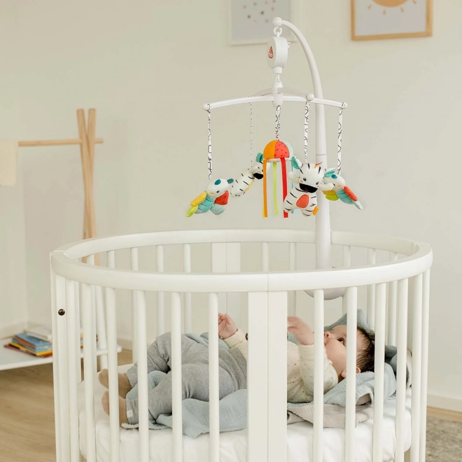 Designul caruselului facilitează prinderea de pătuțul copilului – figurinele pot fi ușor îndepărtate pentru joacă și spălare.