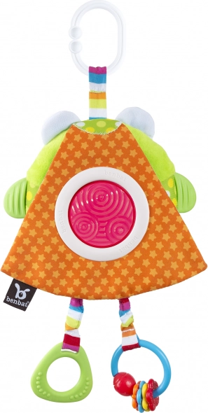Culorile deschise, prietenul adorabil din pluș în formă de animal, panglicile și zornăitoarele nu doar că îi vor distra pe cei mici, ci le vor dezvolta și abilitățile psihomotorii. Zornăitoarea din burtica jucăriei de pluș îl ajută pe copil să se concentreze și să identifice sunetele, iar părțile mobile antrenează coordonarea „mână-ochi”. Clema ușor de fixat pe cărucioare, scaune auto și altele asigură că jucăria va fi mereu orientată către copil. Părțile din plastic nu conțin BPA. Potrivită de la naștere.