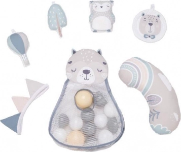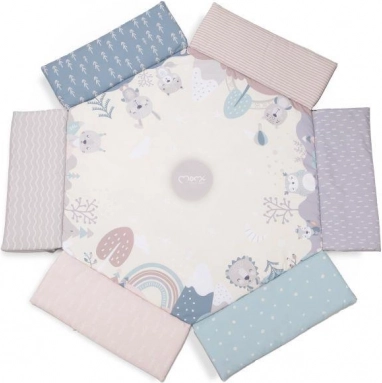 Acest covoraș de joacă este fabricat din material durabil cu proprietăți termoizolante și oferă confort și siguranță. Utilizarea culorilor pastel calmează și sprijină dezvoltarea vizuală a copilului. Completat cu jucării senzoriale care stimulează simțurile copilului și oferă bucurie de joacă.