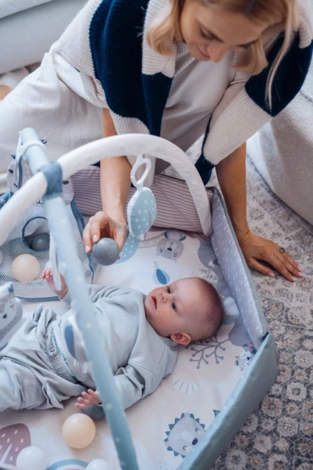 MoMi Pastel combină trei funcții într-una singură – saltea educațională, tarc și piscină uscată cu mingi, oferind mai multe moduri de distracție.