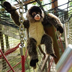 Maimuța din pluș este realizată cu atenție la detalii, imitând o maimuță vie.