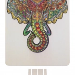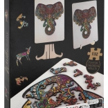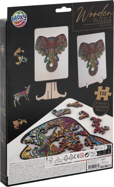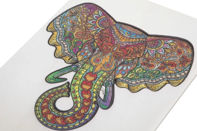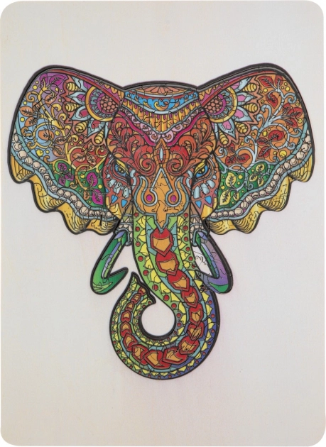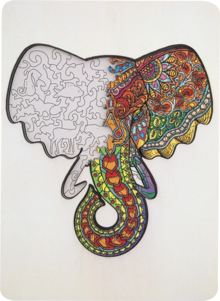 Puzzle-ul este alcătuit din piese colorate, tăiate manual, care împreună formează silueta unui elefant. Piesele includ și mici forme ce amintesc de animăluțe.
