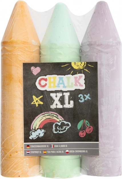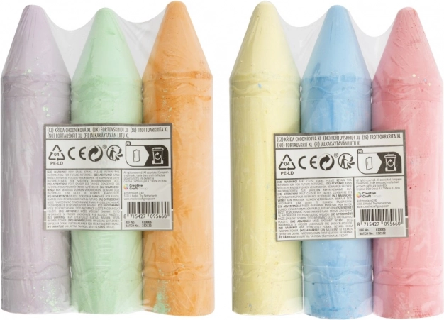 Îmbogățiți activitățile de desenat cu aceste crete colorate XL, disponibile în două variante - galben, albastru și roz sau portocaliu, verde și mov. Fiecare set include trei crete cu lungimea optimă de 19 cm, facilitând ținerea în mână în timpul desenului.