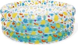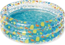 Această piscină stilată pentru copii, cu pereți transparenți și un motiv vesel cu fructe, aduce în grădina dumneavoastră o atmosferă tropicală. Pereții înalți și moi oferă sprijin plăcut și confort, iar construcția cu trei inele asigură stabilitate chiar și în timpul zbenguielii.