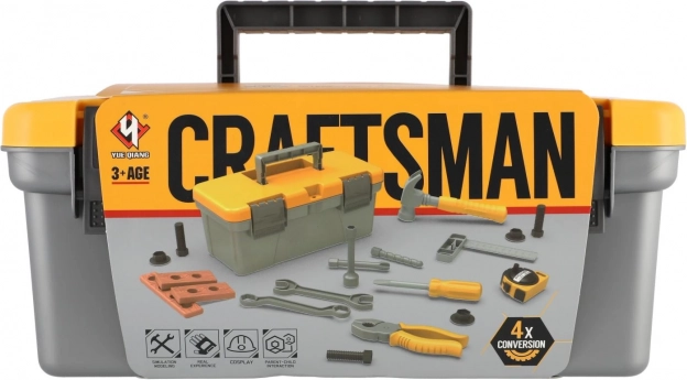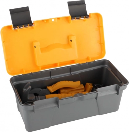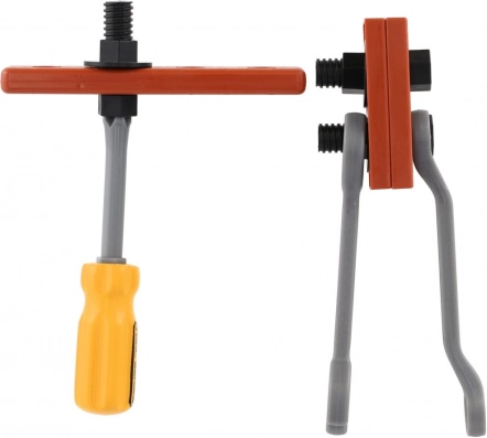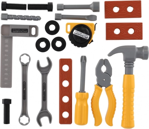 Acest set bogat echipat de unelte pentru copii oferă micilor meșteri tot ce au nevoie pentru o joacă plină de imaginație – ciocănel, clești, șurubelnițe, chei, șuruburi, piulițe, șaibe și plăcuțe „din lemn” pentru îmbinare. Totul este păstrat într-o geantă rezistentă, care se transportă ușor și ajută la menținerea ordinii.