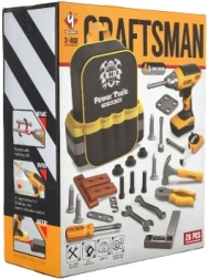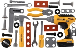 Setul conține 28 de piese de unelte, inclusiv o bormașină cu acumulator, care simulează instrumente de lucru reale pentru joacă distractivă și educativă.