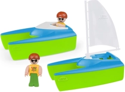Set vele Catamaran Lena pentru un joc distractiv la apă. Conține o navă cu pânze și un catamaran cu velă și două figurine de surferi.