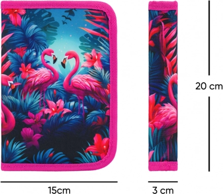 Imprimeul pronunțat cu flamingo și flori tropicale în nuanțe roz-albastre oferă penarului un aspect jucăuș pe care copiii îl vor îndrăgi.